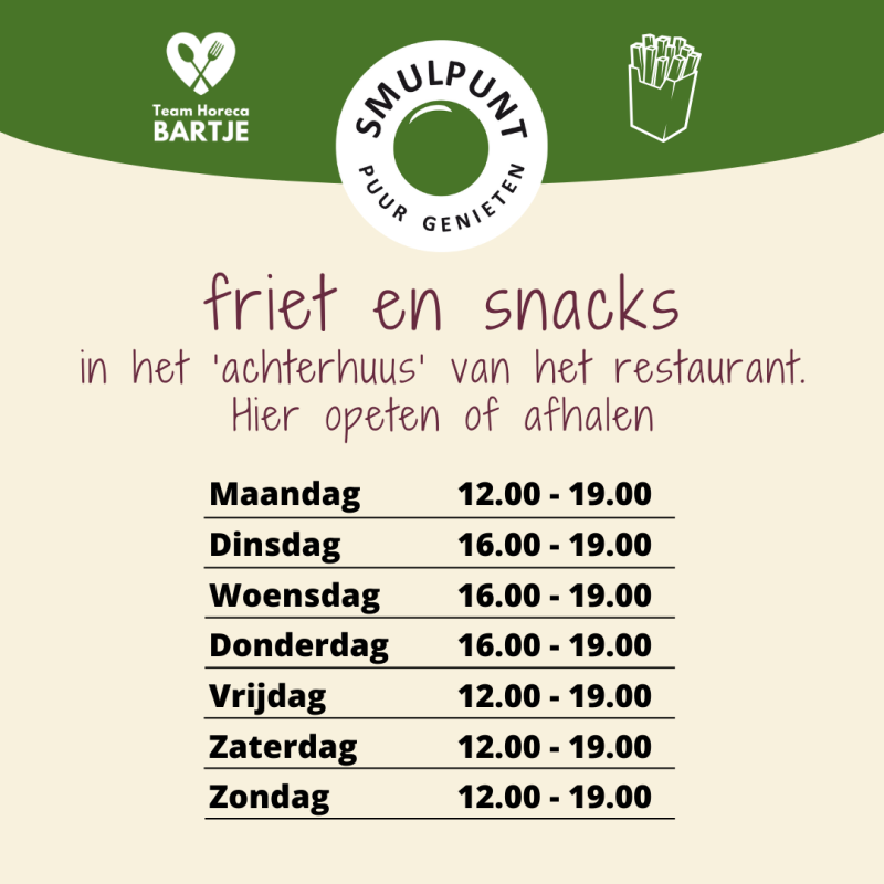 Onze openingstijden zijn afhankelijk van de bezetting op het park. In de schoolvakanties en de meeste weekenden zijn we van 10:00 tot 20:30 uur geopend, voor koffie met gebak, lunch, borrel, plates en afhalen.
